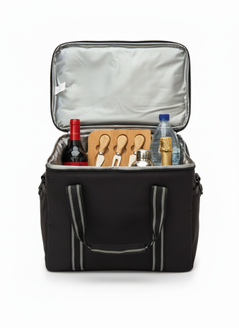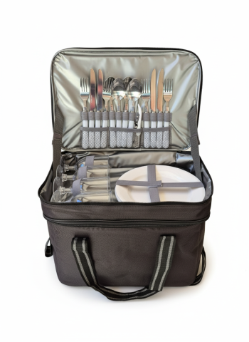 Canasta Cooler picnic Premium para 4 Peronas, muy cómoda para llevar a tus paseos. Compartimiento superior tiene 4 copas plásticas, 4 tenedores, 4 cuchillos, 4 cucharadas grandes, 1 descorchador y destapador. Además, posee un compartimiento principal de gran capacidad con acolchado aislante térmico para mantener sus bebidas frías y todo lo necesario para tu picnic.