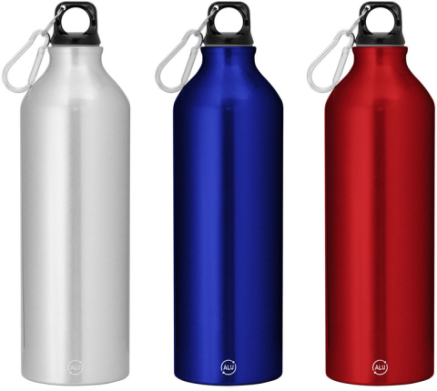 Fácil de llevar a todas partes.Botella de aluminio reciclado. Tapa a rosca plástica con anillo de silicona y con mosquetón (gancho carabinero) en color plateado.Medidas: Ø 7,2 x 25,5 cm. Capacidad: 750 ml. Materiales: Aluminio reciclado y polipropileno.