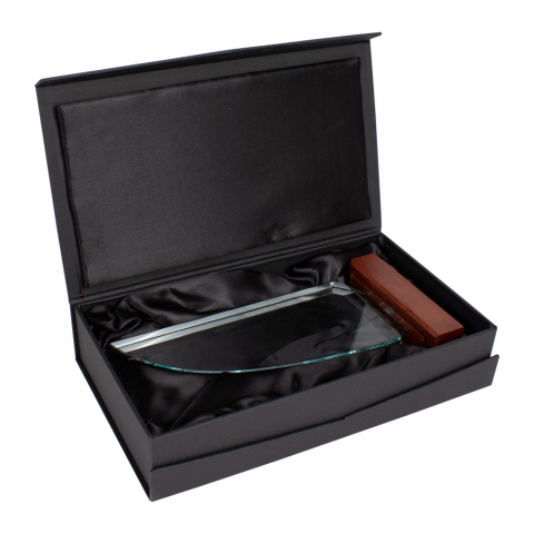 Cotizar variantesElegante Trofeo, base de madera barnizada y cuerpo de cristal con forma de vela. Presentación en caja de cartón forrado negro con cierre imantado, interior acolchado de espuma y tela poliéster satinado negro, con troquel.