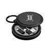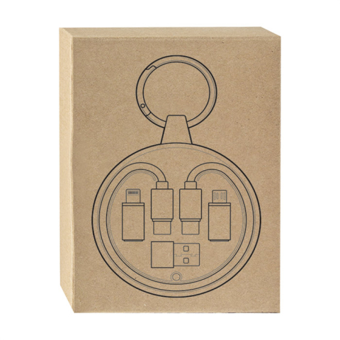 Un cable, todas las conexionesCable de carga rápida. Estuche circular con mosquetón. Accesorios: 1 cable de carga rápida USB tipo C a USB tipo C de 60 W con transferencia de datos, 1 adaptador USB standard, 1 adaptador Lightning y 1 adaptador micro USB. Cierre magnético. Apertura por deslizamiento.Medidas: Estuche de Ø 8 cm x 1 cm. Mosquetón anillo de Ø 4 cm x 0,4 cm. Cable de 26,5 cm. extendido. Materiales: ABS, PVC, poliuretano termoplástico, hierro e imán. Presentación: en caja de regalo Kraft.