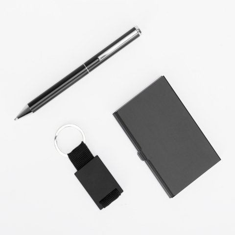 Cotizar variantesSet de Regalo ejecutivo «ARIS», incluye llavero metálico negro con lanyard de poliéster negro + porta-tarjetas de Aluminio negro + Bolígrafo metálico negro con detalles color plata, escritura negra . Presentación en elegante caja de carton color negro con tapa, interior cuna de EVA aterciopelada negra. Sobre funda de papel negro.