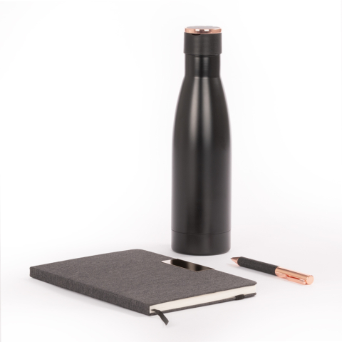 Cotizar variantesSet de Regalo incluye Termo 550 cc. producto BPA FREE, para el contacto con líquidos y alimentos, con tapa twist-off y asa redonda encobrizada + Cuaderno tapa dura recubierta en tela Oxford negro, con cierre elasticado y detalle metálico encobrizado, interior 80 hojas punteadas (dotted) color ivory (hueso) + Bolígrafo metálico encobrizado con tela Oxford negra, escritura negra . Presentación en elegante caja de carton color negro con tapa, interior cuna de EVA aterciopelada negra. Sobre funda de papel negro.