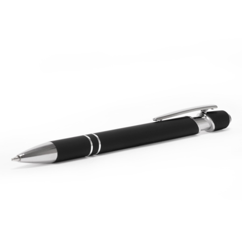 Bolígrafo metálico con cuerpo negro terminación «rubber» y terminal «touch-screen». Escritura azul.