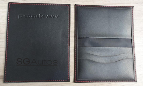 Portadocumento eco cuero standar, medidas: 12x8.5 cms.; eco cuero negro; interior seda; 2 sonrisas en una cara.