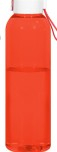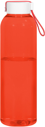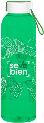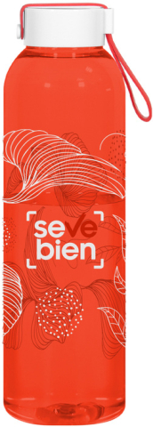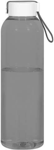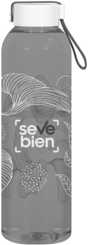 Botella de color translúcido con tapa a rosca plástica de color blanco con correa de silicona del mismo color de la botella.