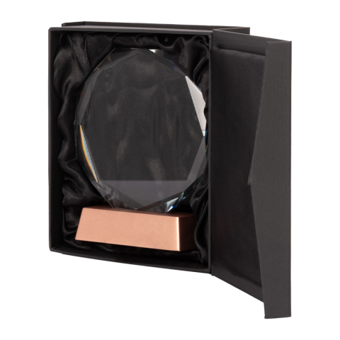 Cotizar variantesTrofeo Galvano redondo de Cristal, con base de acero encobrizado. Presentación en caja de cartón forrado negro con cierre imantado, interior acolchado de espuma y tela poliéster satinado negro, con troquel.
