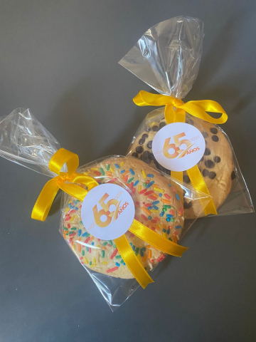 Galletones de vainilla, con chips de chocolate o varitas color, presentados en bolsa celofán, con cinta de satín color a elección según stock.