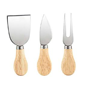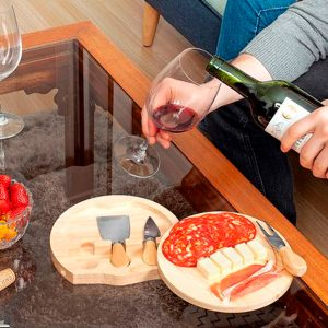 Cotizar variantesTabla redonda para picar quesos de madera con herramientas de acero inoxidable y madera roble.