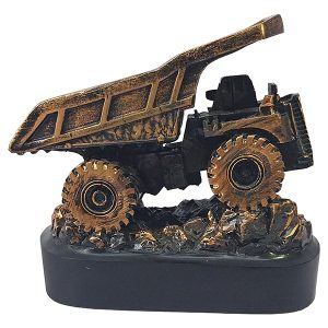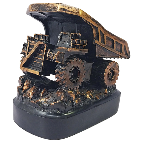 Trofeo de resina grande con forma de camión minero encobrizado. Presentación en caja de cartón blanca.