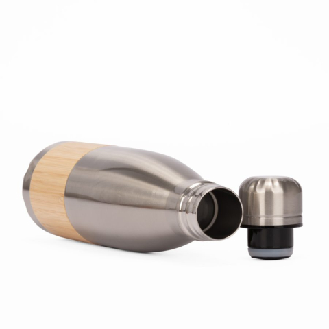 Cotizar variantesBotella de acero inoxidable reciclado con un diseño limpio y atemporal. Con capacidad de 500 ml y doble pared para conservar la temperatura de tus bebidas, combina practicidad y elegancia en cada detalle. Su cuerpo blanco brillante y el elegante recubrimiento de bambú aportan una estética natural que conecta con hábitos responsables. La tapa de rosca metálica asegura un cierre hermético y duradero. Es ideal para marcas que desean proyectar sobriedad, sostenibilidad y estilo con cada sorbo.