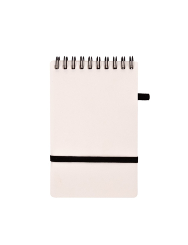 Cotizar variantesLibreta tipo A6 que rompe con lo convencional. Fabricada completamente en papel de piedra, tanto en su tapa como en sus hojas interiores, ofrece una textura suave, resistente al agua y al desgarro, ideal para acompañarte en cualquier entorno. Con 60 hojas gruesas de 120 g, espiral superior, cinta elástica negra y soporte para bolígrafo, está diseñada para durar y adaptarse a quienes necesitan registrar ideas con fluidez y sin interrupciones. Su fabricación libre de pulpa de árbol convierte cada página en un pequeño paso hacia un futuro más sostenible. Ideal para marcas que apuestan por la innovación y el cuidado del entorno, en un formato práctico y siempre listo para escribir.