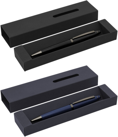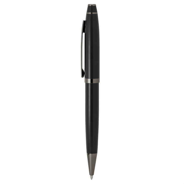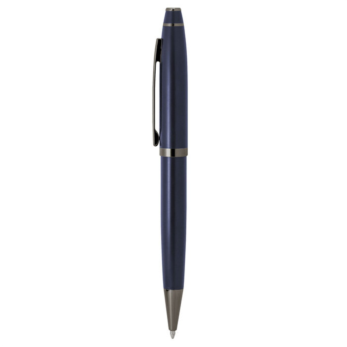 Cada detalle comunica distinción.Bolígrafo con apertura giratoria. Cuerpo de acero inoxidable de color con acabado mate. Clip, anillos y punteras metálicos color gun. Destape plata. Recarga metálica. Medidas: 13,5 cm. Materiales: Acero inoxidable, hierro y aleación de cobre y zinc. Peso: 25 g. Tinta: azul Presentación: en caja de regalo con ventana y acabado engomado del color del bolígrafo.