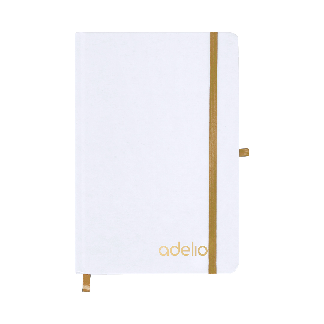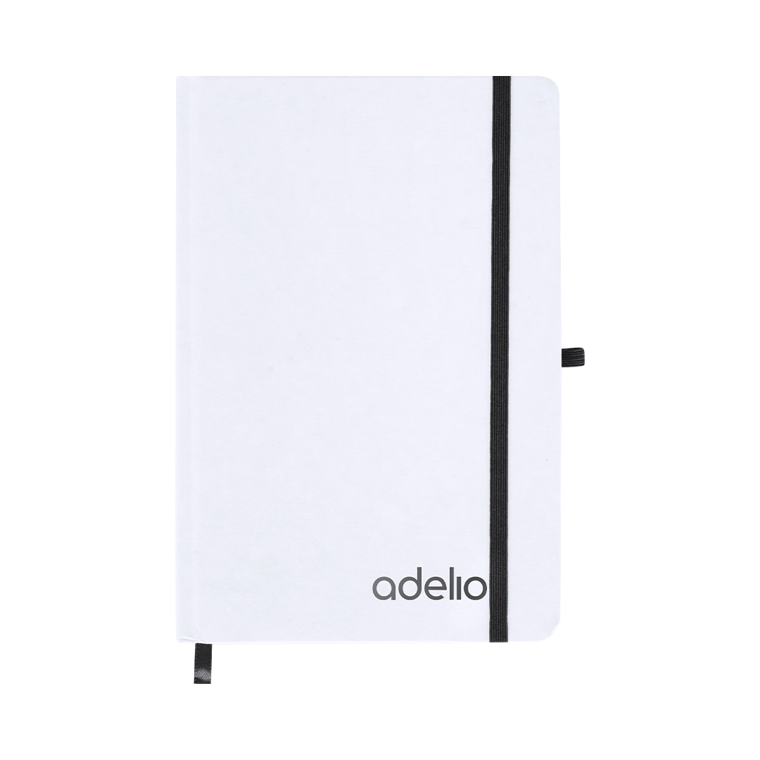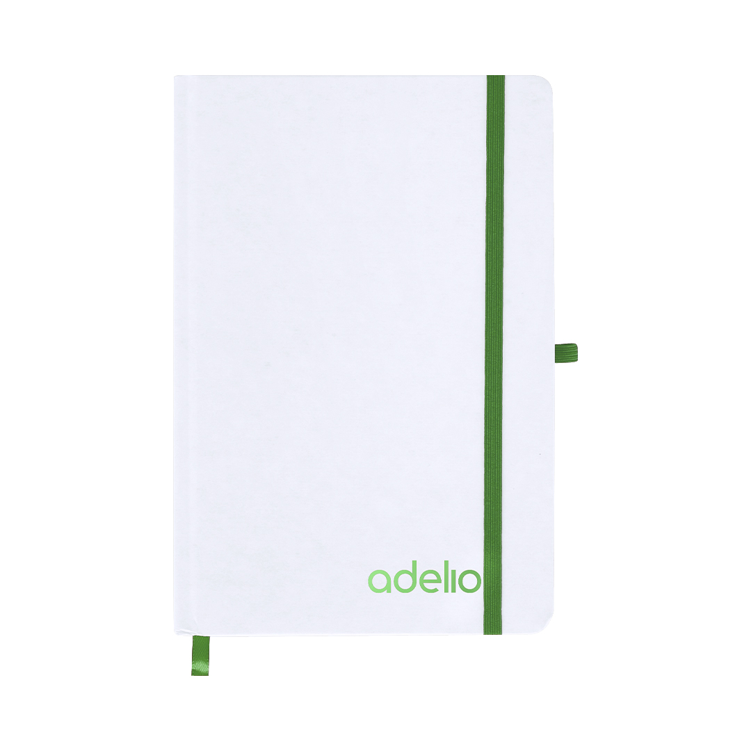 Bloc de notas con tapas rígidas blancas fabricadas en Cartón Reciclado. Interior con 80 hojas a disposición de una raya. Incluye marcapáginas, en mismo color que cinta elástica de cierre y portabolígrafos. Especial para grabado láser mostrando el color seleccionado.