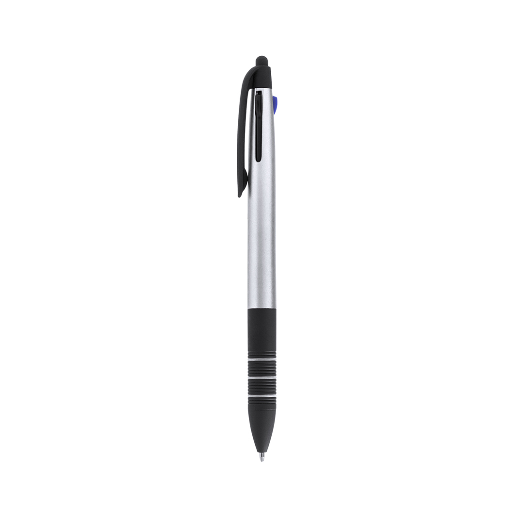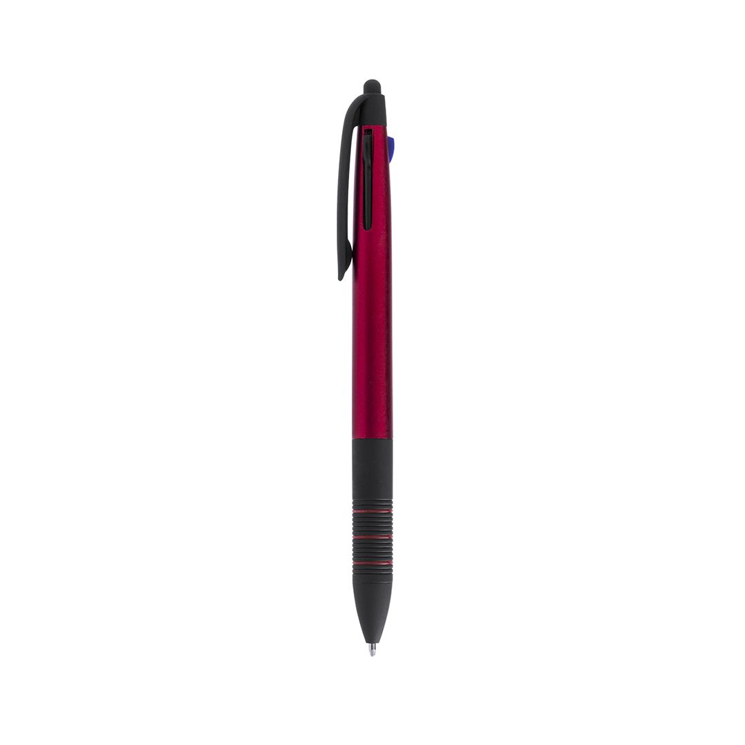 Bolígrafo puntero 3 en 1 de mecanismo pulsador retráctil, de actual diseño y cuerpo de suave acabado metalizado en vivos colores. Con accesorios en negro y suave empuñadura ergonómica en color negro con anillas a juego. De 3 cartuchos en tintas azul, roja y negra.
