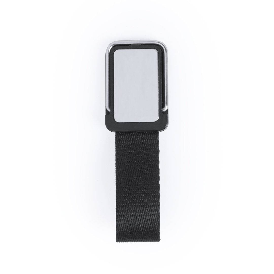 Original soporte adhesivo para smartphone con cinta para selfies en resistente poliéster y pastilla central para marcaje. Con soporte metálico y presentado en atractiva bolsita de diseño.