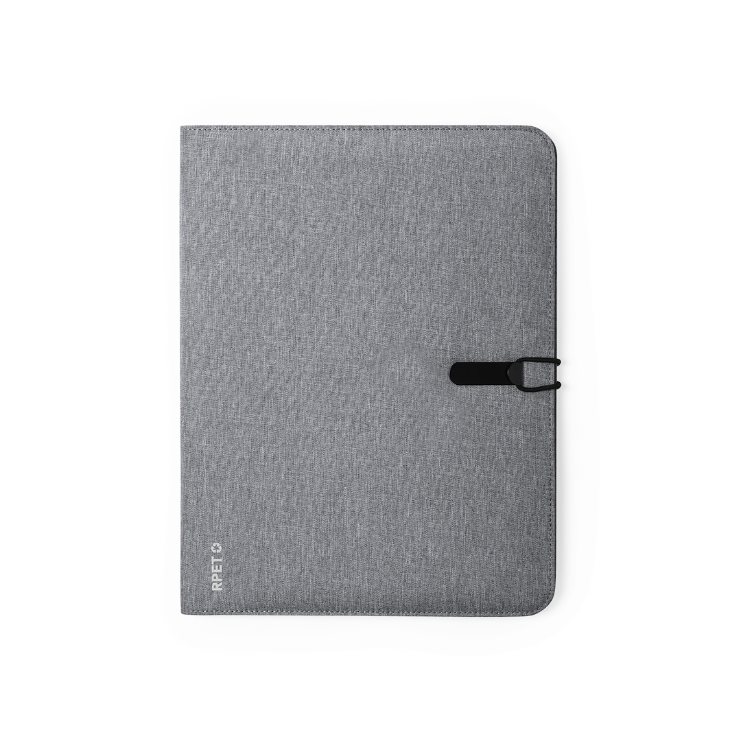 Elegante carpeta de línea nature tamaño A4. Fabricada en resistente 600D RPET efecto melange, elaborado a partir de plástico reciclado para así fomentar la reutilización de residuos plásticos y contribuir a la sostenibilidad del planeta. Detalles en negro y cierre metálico con cinta elástica especialmente diseñado para marcaje en láser. Interior con bloc extraíble de 20 hojas con disposición a una raya, 3 bolsillos de solapa, tarjeteros y soporte para bolígrafo. Distintivo RPET en esquina.