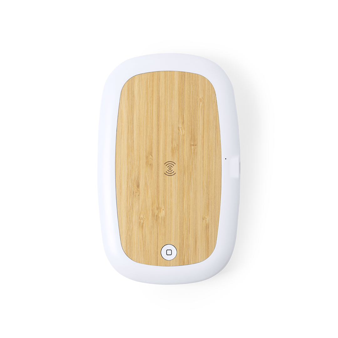 Caja esterilizadora de línea nature, con base de carga en bambú. Luz ultravioleta tipo C, con cargador inalámbrico 5W para smartphone integrado en tapa. Especialmente diseñada para la eliminación de microorganismos y bacterias en objetos de uso cotidiano como el smartphone, llaves, gafas, mascarilla, auriculares, smartwatch... Fabricada en resistente material ABS de acabado mate y presentada en atractiva caja individual de diseño. Fácil de usar, basta con introducir el objeto dentro de la caja. Potencia de bombilla 1W longitud de onda de 270-280 nm, con alimentación mediante cable USB Tipo C de 1m de largo con color a juego. Tiempo de esterilización de 5 y 10 minutos con función auto-apagado. Disponible manual de usuario en español e inglés. Disponible certificación CE, RoHS y de efectividad germicida.