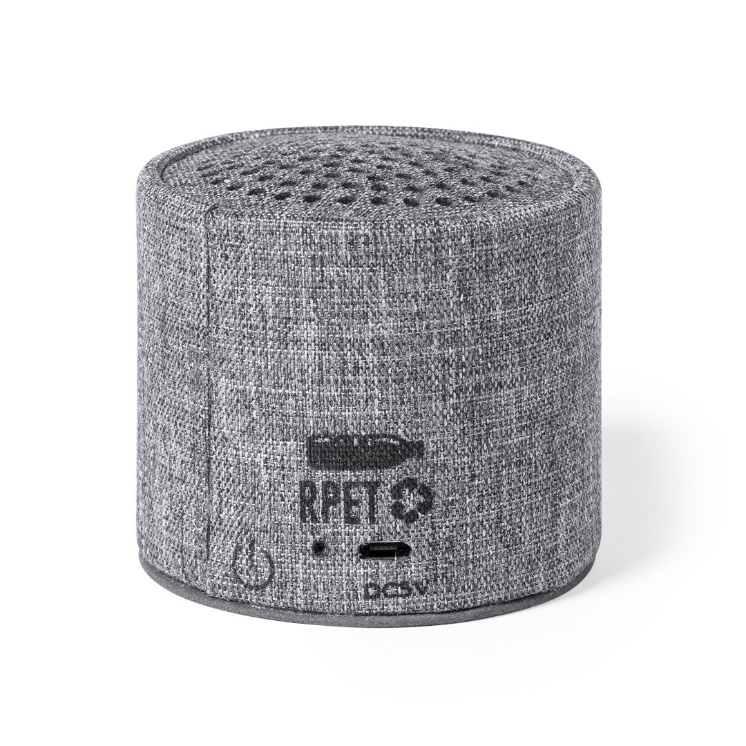 Compacto altavoz de línea nature y conexión Bluetooth 5.0. Carcasa fabricada en poliéster RPET, elaborado a partir de plástico reciclado, para así fomentar la reutilización de residuos plásticos y ayudar a la sostenibilidad del planeta. 3W de potencia, compatible con iOS y Android. Incluye cable de carga micro USB y base antideslizante. Presentado en atractiva caja de diseño eco. Con distintivo RPET sobre el artículo.