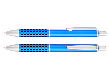 Cotizar variantesBolígrafo metalizado GMAX, con lunares de goma negra que brindan una suave sensación de masaje dactilar al escribir. Escritura azul.