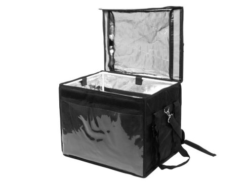 Cotizar variantesEl más completo bolso-mochila para Delivery con capacidad de 31 litros, tamaño 40 x 28 x 28 cm. Interior aislante térmico y esqueleto plástico para mantener la estructura del bolso. Incluye bandejas para división interior, espuma sólida para el transporte de 4 latas, vasos o botellas, y bandas reflectantes para visibilidad nocturna. Puedes transportarlo tanto de mochila como en la parrilla trasera de tu moto o bicicleta!! n nLo brillante son bolsillos exteriores de PVC clear translúcido , se puede incorporar gráfica ahí o bien imprimir logo directamente sobre los espacios libres con tela poliéster negro.