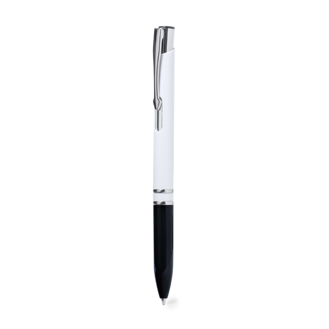 Elegante bolígrafo con mecanismo pulsador. Con cuerpo acabado en color blanco brillo y empuñadura en variada gama colores. Fabricado en resistente ABS acabado brillo. Con carga jumbo y tinta azul.