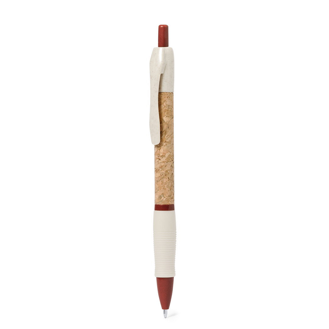 Bolígrafo de mecanismo pulsador con cuerpo en corcho natural. Clip, punta y pulsador en caña de trigo. Disponible en variada gama de colores. Distintivo Wheat Straw en la parte superior del bolígrafo. En tinta azul.Elaborado con elementos vegetales, para así fomentar la utilización de materias primas naturales y reducir las emisiones contaminantes.