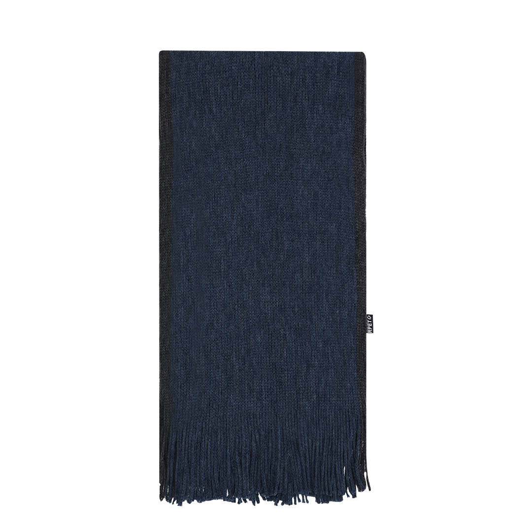 Suave y cálida bufanda confeccionada en cálido poliéster RPET. Fabricada en elegantes colores bitono con bordes en distinto color, terminación en flecos. Con logotipo RPET en etiqueta. Presentada individualmente en caja negra. El material RPET se elabora a partir de plástico reciclado, para así fomentar la reutilización de residuos plásticos y ayudar a la sostenibilidad del planeta.